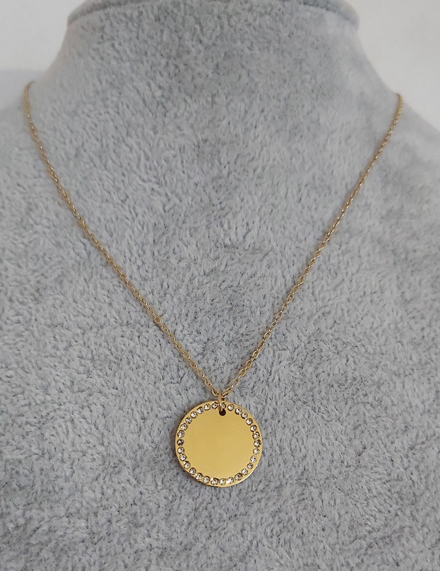 Ce magnifique collier en acier inoxydable doré sa chaîne délicate , met en valeur son médaillon rond poli à la brillance et à strass où vous pouvez graver votre message , Résistant à l'eau et à l'usure ce bijou ne ternit pas avec le temps